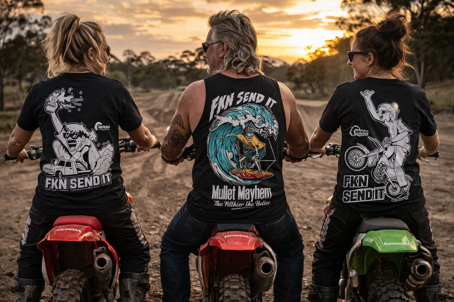 Mullet Mayhem is more than a brand -it’s a lifestyle.Built for chaos, loud nights, dusty roads, and full-send energy.If you live wild and wear it proud, you’re already one of us.